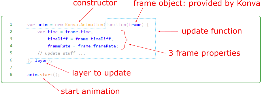In Konva, use Konva.Animation constructor to make an animation. The constructor takes two arguments: