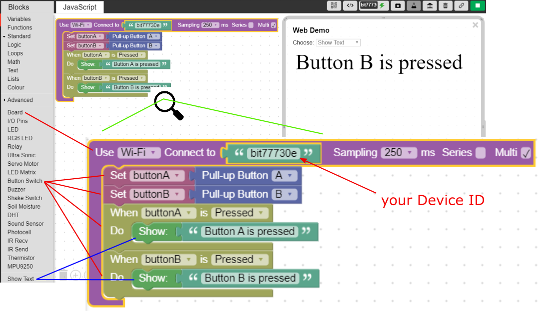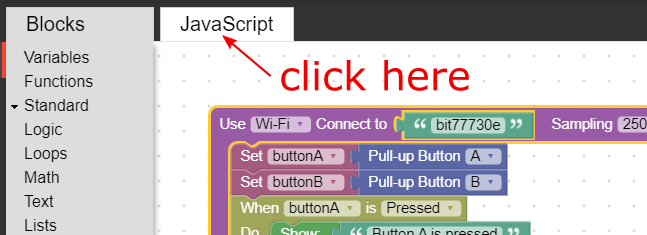 Let's design a simple program which can detect the button click of the Webduino Bit board. Then we will examine its HTML/CSS/JS codes. After we find its codes, we can merge them with what we have learned.