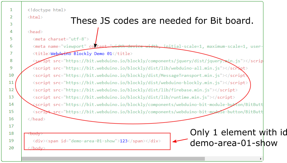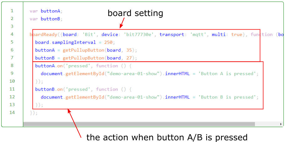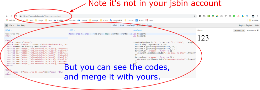 Put the generated codes in your own jsbin account and make it a web page which can show the button status of the Webduino Bit board. You don't need the platform to run the codes anymore.