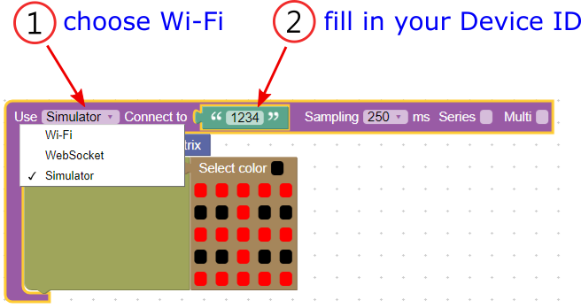 If your device is already connected, then change the simulator to Wi-Fi, fill in your Device ID and run your code. You should see the LED pattern shown in your board.