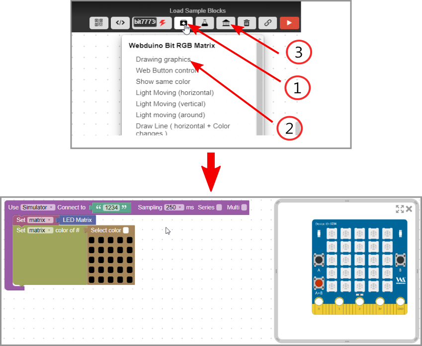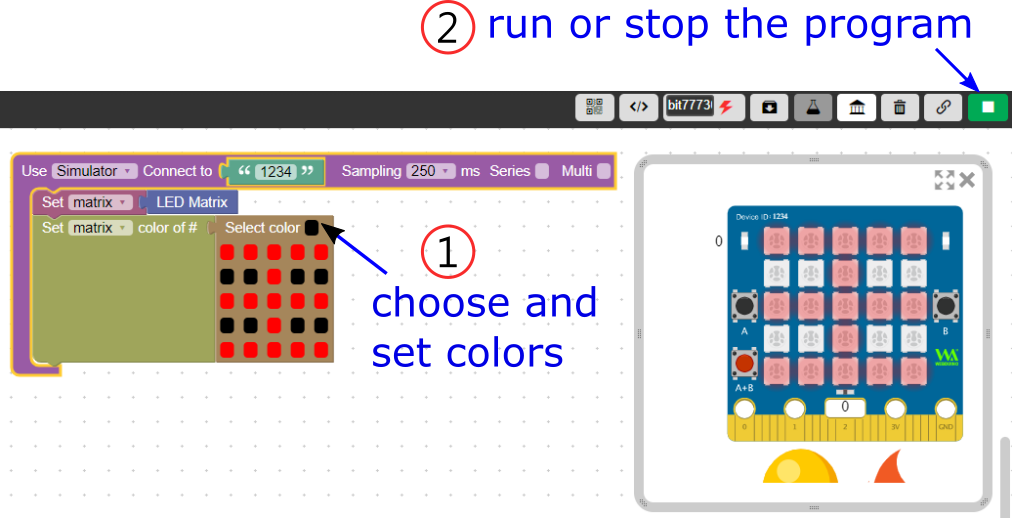 The platform supports a simulator to run the code if you don't have a Webduino Bit board. If you have a real board, you need to initialize it before using.