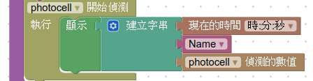 輸出要有時間和姓名,使用文字字串,把時間、姓名和資料都串在一起再輸出。(建立字串積木到文字模組去找,時間積木到進階功能裡面的控制台去找)