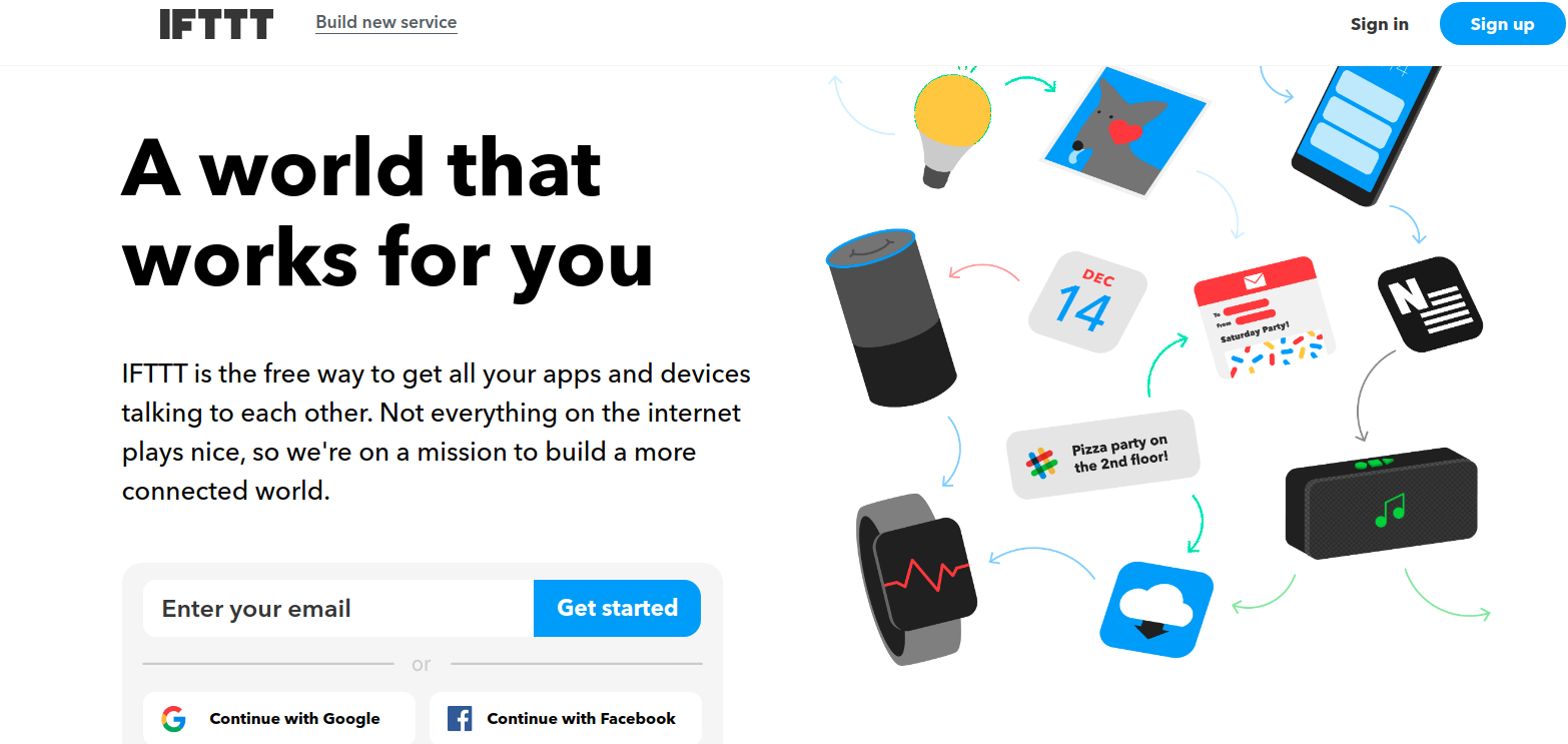 首先連到 IFTTT 的 官網,進入後會看到以下這個畫面。那我們要先註冊一個帳號,可以看到畫面左下方,直接使用 Google 或 FB 帳號,或者使用自己的 Email 註冊。