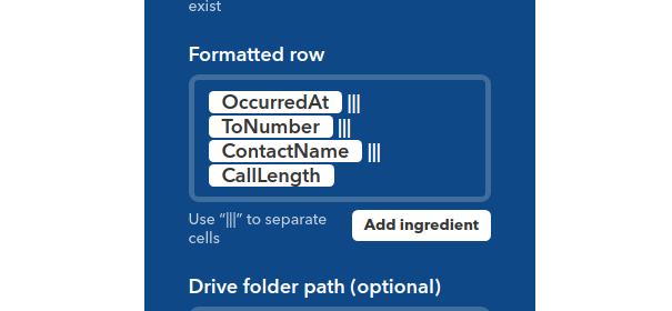 回到 IFTTT 網站,在這個 Applet 的右上方按一下齒輪,會進入設定頁面,應該可以看到以下的畫面,這邊就是讓使用者設定撥出電話時,所要記錄的欄位,可以設著做一些修改,再重新撥一次電話,看看記錄的結果有何不同。