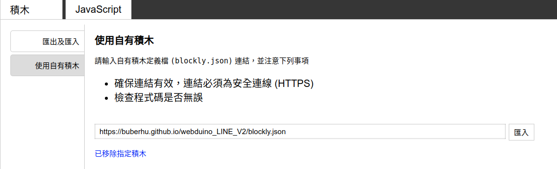 1. 在 Webduino 發展平台中,將 Buber 的 Line 自訂積木匯入,匯入網址為 https://buberhu.github.io/webduino_LINE_V2/blockly.json