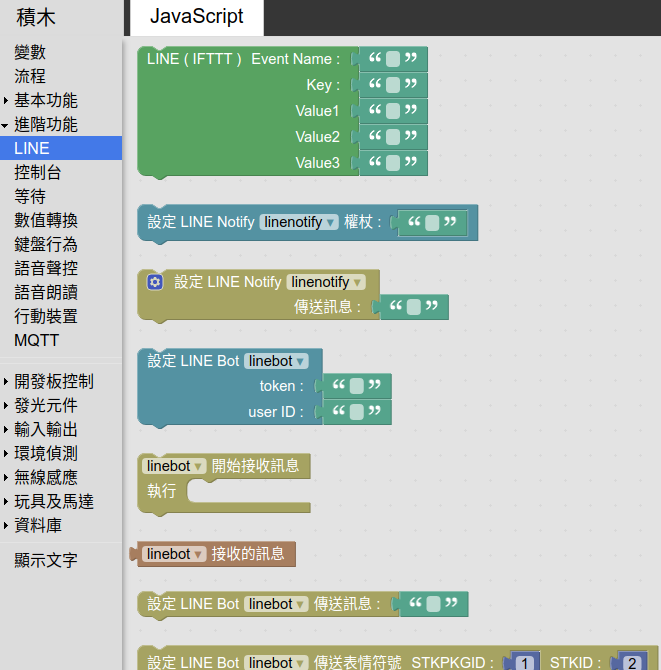 2. 匯入之後回到積木的分頁,點選進階功能,再點選 LINE,會看到很多新的積木出現。